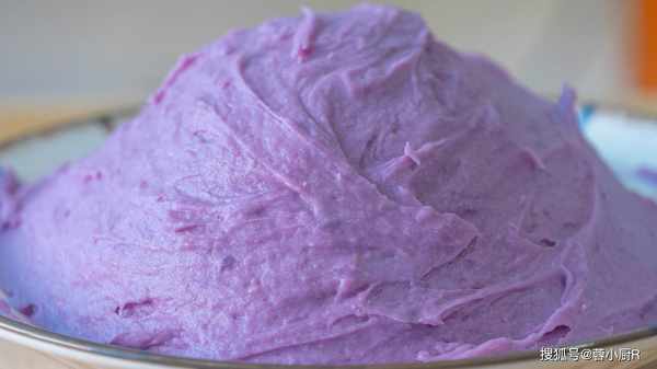 3、关火后取出来先剥皮,然后倒入料理机里面,加100克牛奶,一起打成细腻的紫薯芋泥,打好后先倒出来备用。