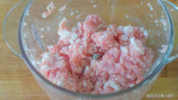 7、最后再来半斤猪肉,洗干净后切成大块儿,然后加绞肉机里面打成肉末,喜欢吃点颗粒感的就自己手工剁馅儿吧,打好后倒出来先放一旁。