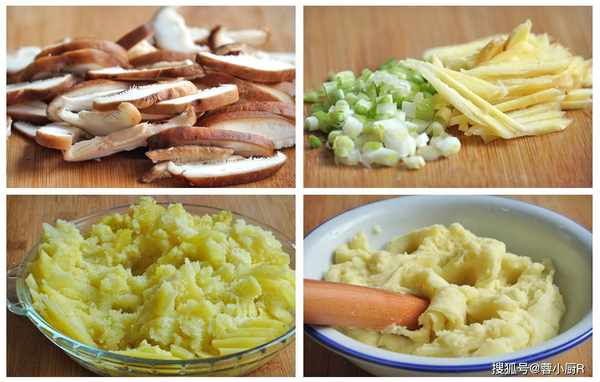 4、土豆蒸熟后趁热捣成土豆泥,加点盐,捣到没有土豆颗粒后加180克土豆淀粉,揉成软硬适中的面团(软硬适中就是能团成团也不会裂开);