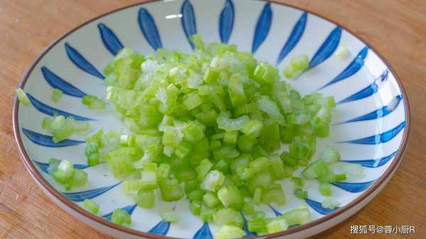 4、再来两根儿芹菜,洗净后切碎,芹菜是特别香的,放一点到馅儿里面特别好吃。