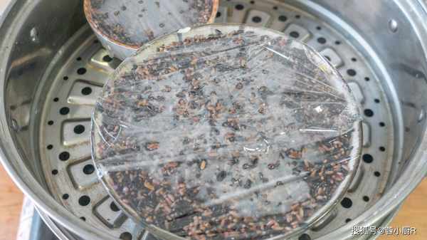 5、然后舀入一大勺糯米铺平整,中间再舀入紫薯芋泥,接着再次舀入剩余的糯米,压平整后盖上保鲜膜,然后扎孔透气。接着就可以开始蒸了,冷水上锅,中火蒸2个小时,糯米蒸熟透后就可以取出来了。