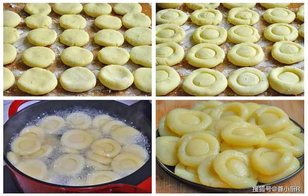 5、取一小块搓成小圆球,压成小饼,找一个小瓶盖,往中间压一下,这就是我们今天土豆小饼的造型;