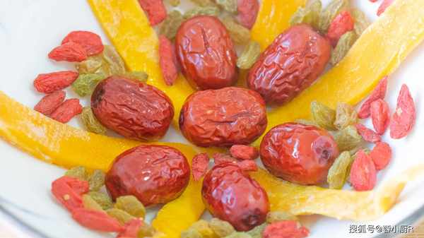 4、接着准备点红枣、葡萄干、枸杞、芒果干,芒果干用剪刀剪成小长条,红枣、葡萄干、枸杞用清水洗掉表面的灰尘就行。接着准备一勺猪油,用开水隔热化开。然后准备一个大碗,先刷上一层猪油,碗底均匀的摆上果干,怎么好看怎么摆,不用太在意。