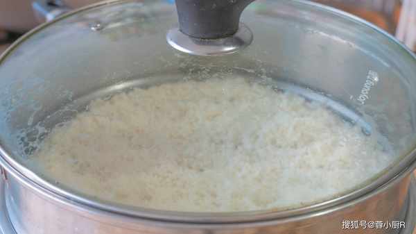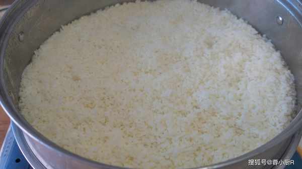 1、先准备400克大米,清洗干净后加水提前泡3个小时,泡米的时间不能太短,泡好倒出来沥干水分,然后倒入蒸屉上铺平整,接着就是上锅蒸,大火蒸30分钟就差不多了。