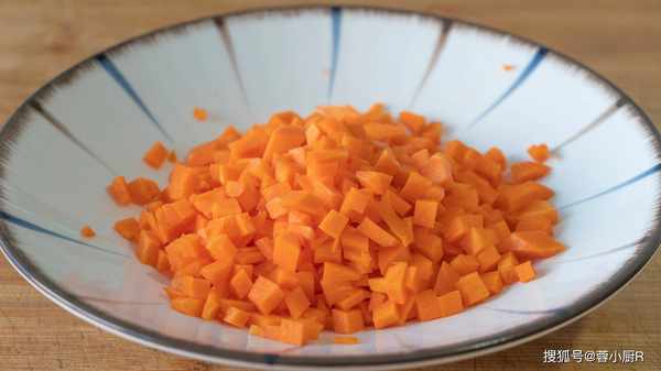 5、胡萝卜也来一根儿,洗净后先削皮,然后再切成小丁。