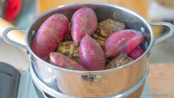 2、我们再准备300克芋头和300克紫薯,清洗干净后上锅蒸,不用去皮,大火20分钟就差不多了,用筷子能轻松插透就熟了。