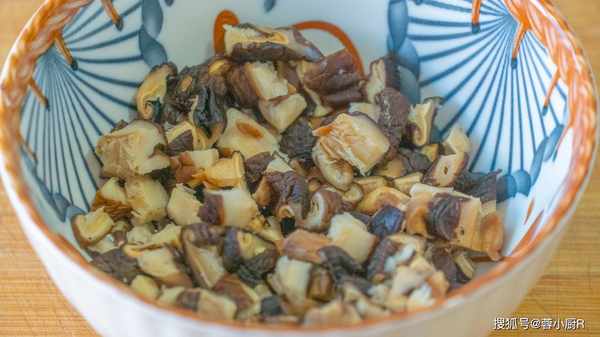 8、这时候香菇也泡好了,挤干水分后切成小丁,香菇水不要倒了,可以留着等下用,这个香菇和香菇水都是整个馅儿的灵魂之处,所以强烈建议一定要加。