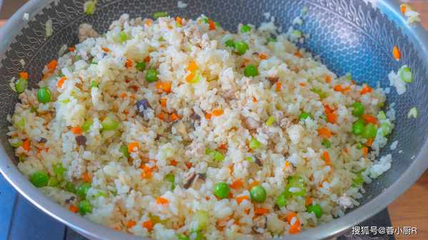 10、接着起锅热油,下洋葱爆香,再把肉沫倒进来,大火翻炒至变色。接着倒入胡萝卜、香菇、青豆、芹菜,翻炒均匀后把米饭也倒进来一起炒。先把米饭尽可能地炒散,接着来调味儿,盐、鸡精、生抽、蚝油,继续翻炒均匀上色入味儿。