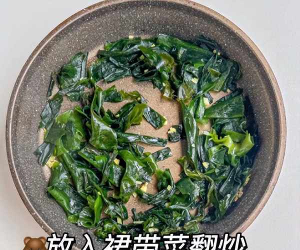 4:锅中慢慢烧热一会儿,放入一些葱花和生姜丝,迅速炒出香味,放入一些裙带菜炒至变软,加上两碗清水煮开。