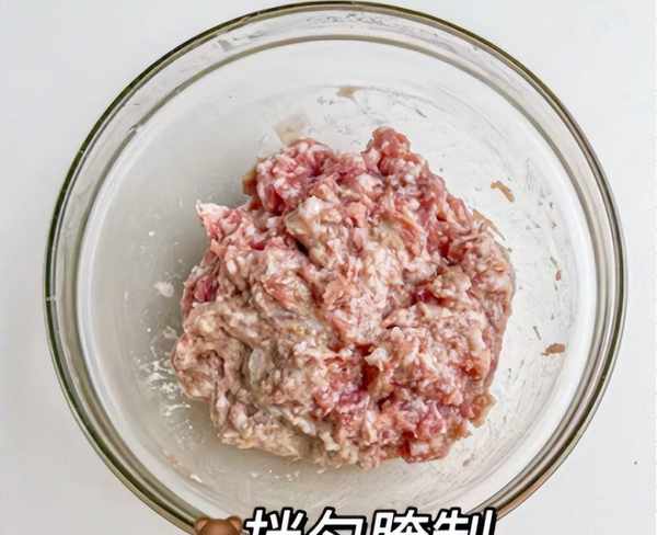 2:猪肉放在容器里,分别加上半勺生抽,一小勺蚝油,加上食盐和鸡精半勺,加上一些马蹄(马蹄去皮剁碎成细末),加上一个蛋清和少许红薯淀粉,加上一些葱姜水,用筷子搅拌均匀,用手抓拌均匀,腌制一会儿。