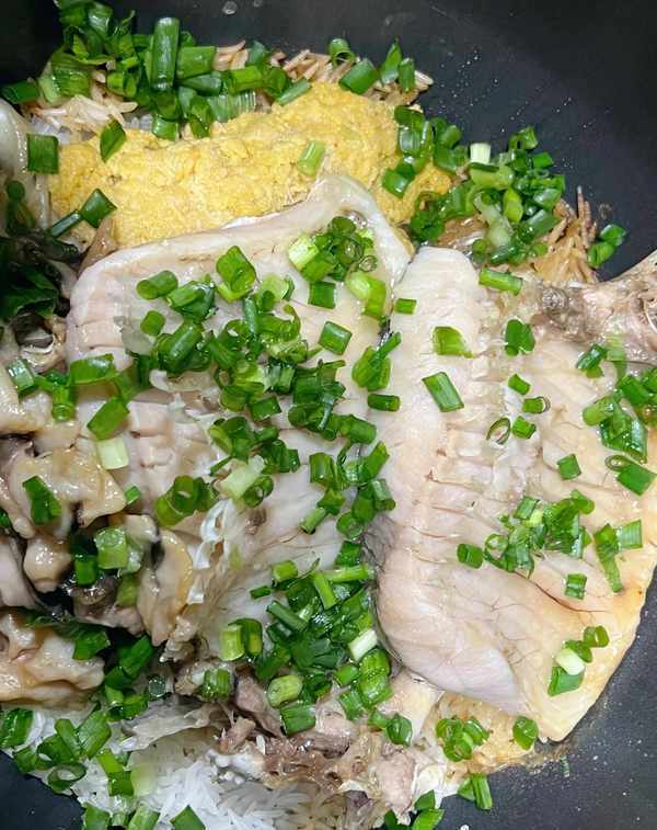 6.水开后放入鱼摊平,捞出后撒上葱花