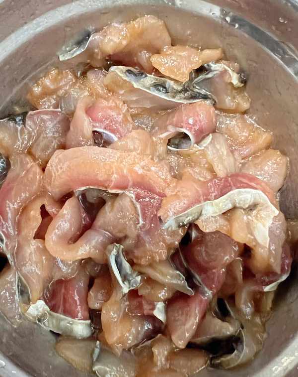 4、将鱼切成片,加盐、酱油、胡椒粉和少许生粉腌半小时。
