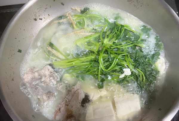 7.将剩下的骨头稍稍煎一下,做一道鱼骨香菜汤