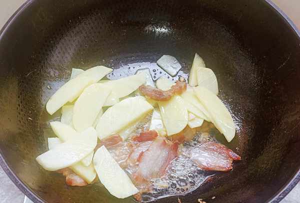 4.加入土豆片再搅拌2分钟。这种操作可以使土豆在煮熟时更容易变软变质。