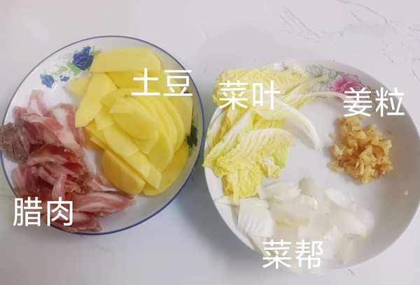2.将五花肉切成薄片。准备一小块生姜,压扁,切成小粒,这样比较容易出香味。准备一个土豆,洗净切成薄片备用。准备白菜,菜叶和菜梗分开,菜梗斜切成块,菜叶顺着纹路撕成小块。