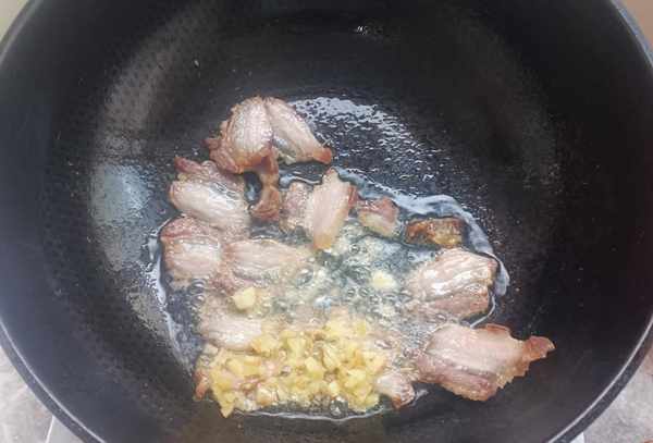 3.所有的材料都准备好了,开始做菜吧。锅里放油烧热,将五花肉放入热油中,将腊肉翻炒去油。然后加入poutine,去腥增香,减少肉的油腻感,再煎1分钟,让肉和姜的味道融合。
