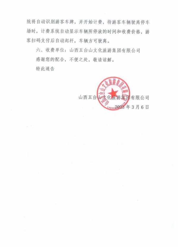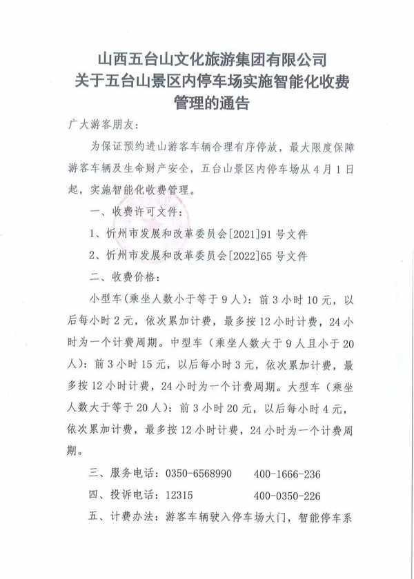 为保证预约进山游客车辆合理有序停放,最大限度保障游客车辆及生命财产安全,五台山景区内停车场从4月1日起,实施智能化收费管理。
