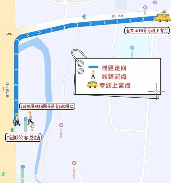 市民乘客可乘坐地铁二号线至梅园开原寺站10号口出站,由东往西步行100米至青龙山路口后,再由南往北步行150米到梅园小学,即可乘坐青龙山扫墓专线。