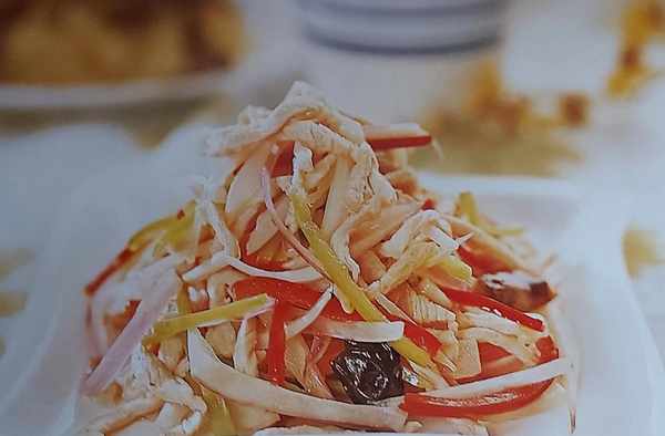 2猪瘦肉切成丝,入沸水锅中汆烫一下,立即捞出,沥干水。