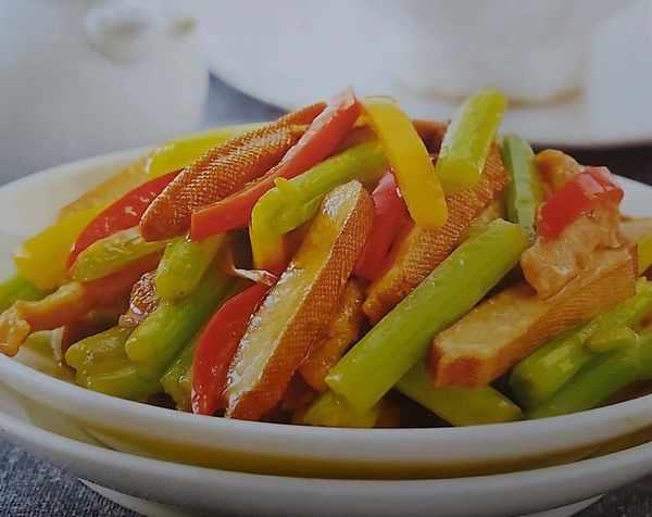 芹菜200克、香干100克、肉丝60克、彩椒条30克