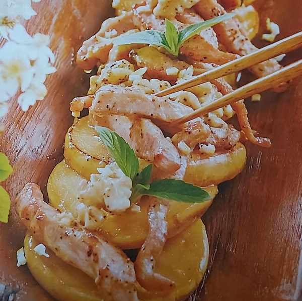 6煎制好的松阪肉条与鲜桃仁混合炒制。