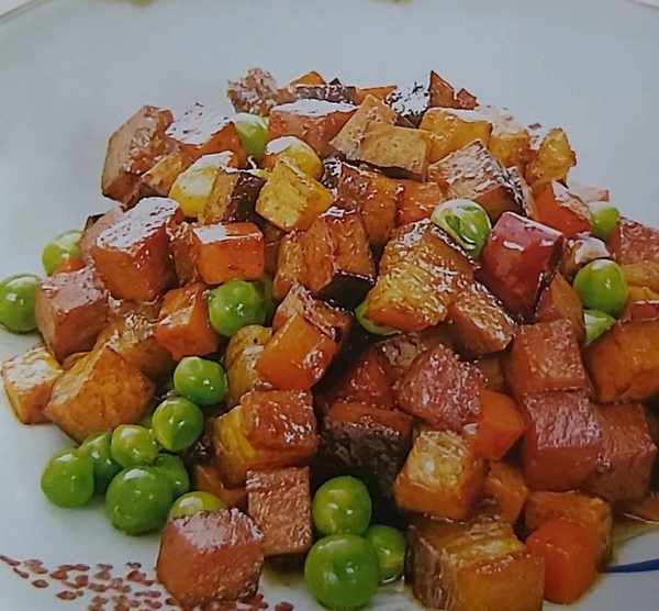 腊肉、胡萝卜各100克、香干150克、青豆50克
