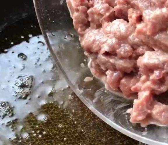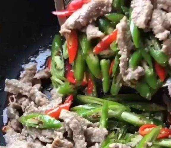 把辣椒和牛肉下入锅中。
