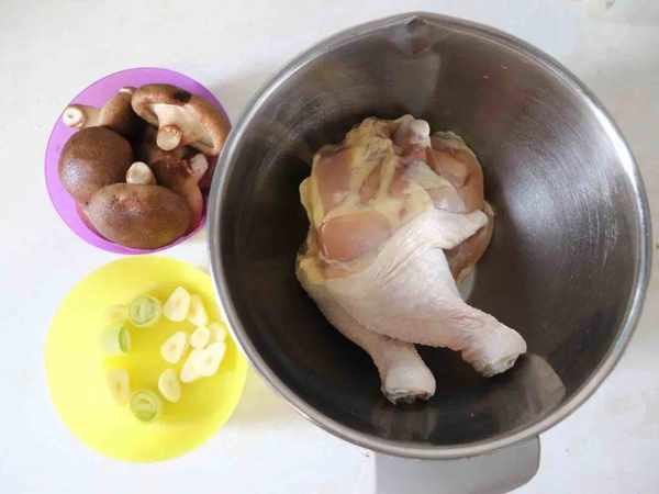 1.准备好所需要的食材,香菇,鸡腿洗净,控干水份