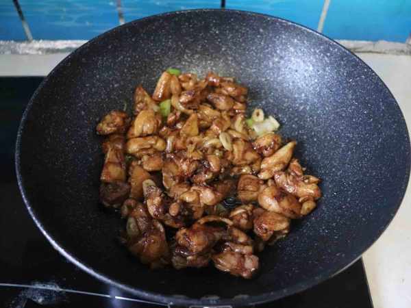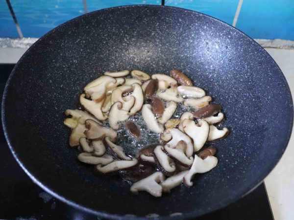 7.热锅凉油下入葱蒜爆香,下入鸡腿肉翻炒至鸡肉变色,盛出备用,锅中加底油,下入香菇片翻炒至变软