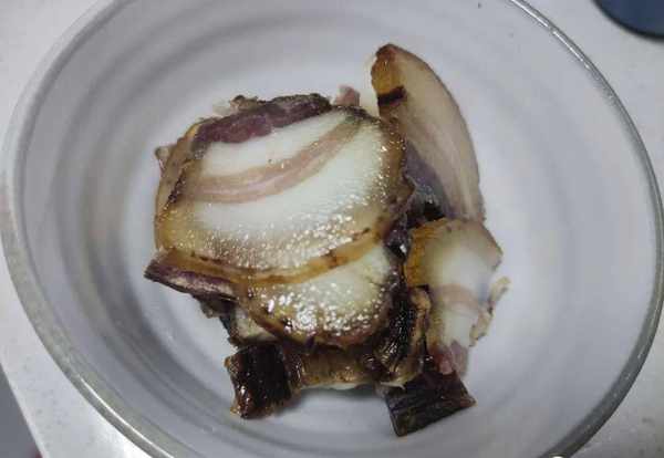 2.取一小块腊肉,腊肉不用太多,一小块儿可以增加味道就好了。腊肉放在清水中洗干净,放锅里面加入水,焯水一下。焯水后捞出放着切片,切好后的腊肉放在旁边;