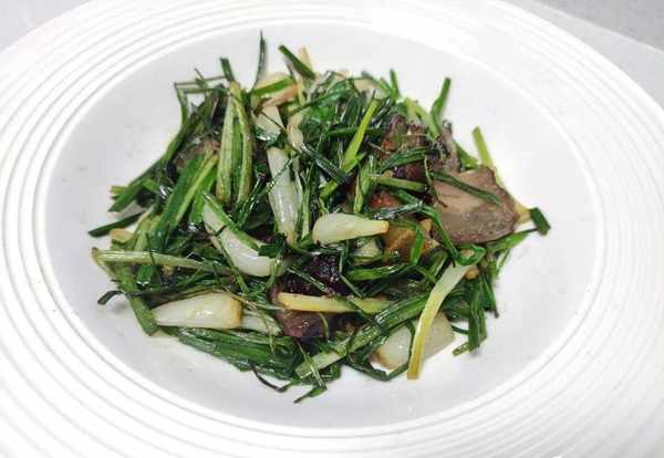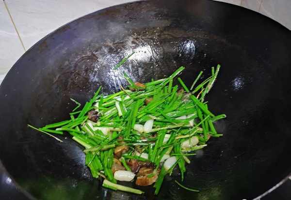 4.炒的时候也是一样,不停地翻动,将锅中的野葱和炒熟后就可以关火出锅了。出锅后盛出放在盆中,这样一份鲜美而营养的腊肉野葱头就完成。