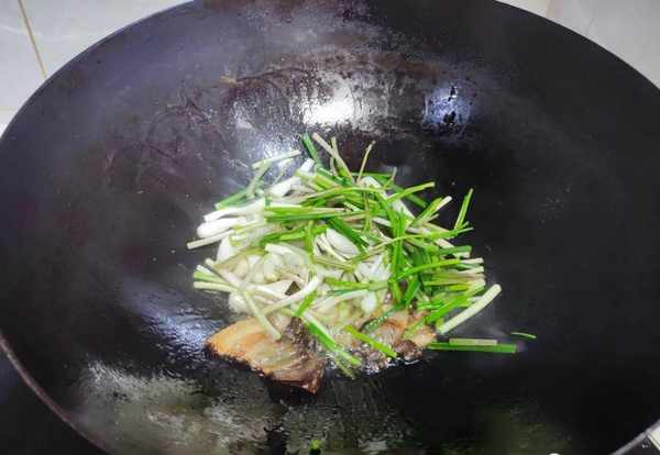 3.备用锅中倒入油,将切好的腊肉放入油锅中。一点点的油,将锅中的腊肉炒一下,炒出香味来。腊肉经过煸炒,会将里面的油脂煸出来。炒好之后可以看到底部有一层油,我们再把切好的野葱头倒入里面,野葱头非常的鲜嫩,在炒的过程中开大火,而且铲子要多翻动。大火,如果没有翻炒的话,容易将野葱的叶子给它煮焦,这样煮出来的口感,干柴如同叶子一样,非常难吃;