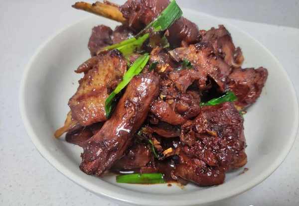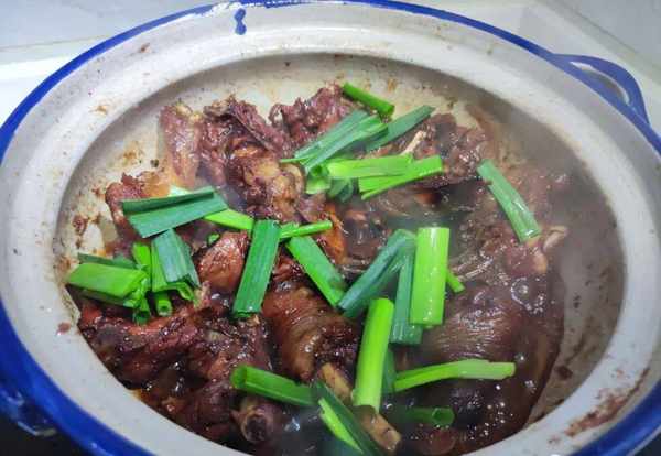 煮个25~30分钟,里面的汤汁也收得差不多,打开锅就可以闻到一股香香的味道,特别好闻。开锅后再将里面的汤汁收干一下,然后把备好的蒜苗叶子放入里面蒜叶放入后,再盖上盖子焖个一分钟;