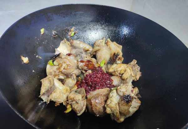 5.紧接着我们把焯水后的肉倒入里面,用铲子给它翻炒一下,炒均匀。将肉面炒至微微焦,鸡肉的皮炒至微微焦黄,可以将里面多余的油脂给煸出来这样子做出来的鸡肉口感会鲜美润滑,而且味道特别好;