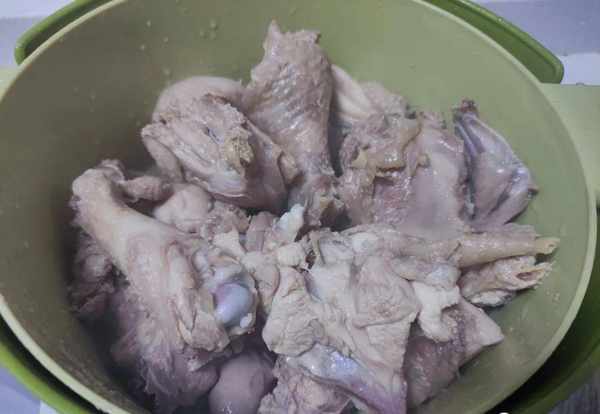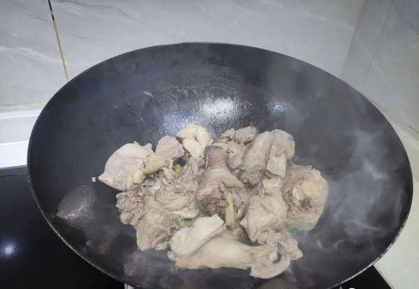 3.锅中倒入水,然后把洗净后的鸡肉倒入锅里面。将锅中的食材煮开,把鸡肉焯水一下。焯水的过程中,鸡肉会有一些白色的漂浮物,我们给它捞出,焯水后的鸡肉再用清水冲洗两三遍,鸡肉洗干净之后放在盆中备用;