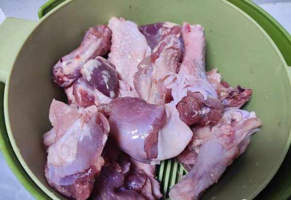 1.将备好的鸡肉放的垫板上给它切成小块,切后的鸡肉放在案板上。放在盆里面加入清水,冲洗干净。洗鸡肉的时候要多洗几遍,可以更好地将它洗干净。鸡肉洗净之后捞出放在盆中备用;