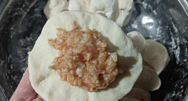 9、一手托皮,皮中心放入适量的肉馅,一手提边,慢慢捏褶收口,一个包子就完成了。