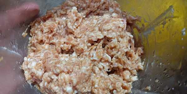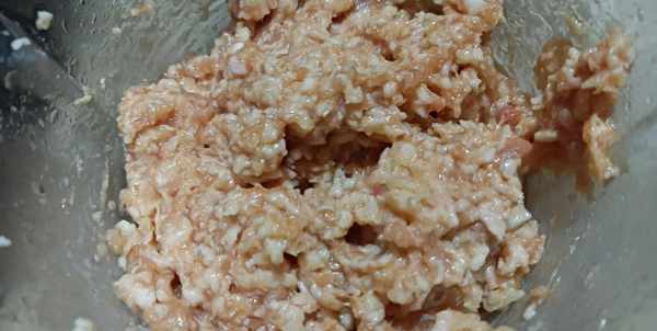 5、切碎的马蹄放入肉馅中搅拌均匀,再加入一勺花生油搅拌均匀,锁住肉馅的水分。