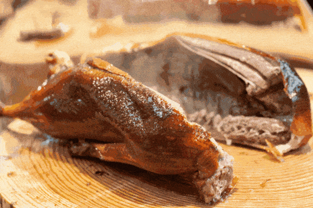 烧得红棕均匀的鹅皮,表面泛着油光,看着就让人食指大动,鹅的皮下脂肪丰盈,一咬满嘴油脂香。