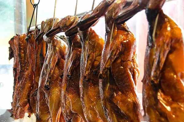 不需要吹皮,腌制后吊干直接烤制即可,烧出来的鹅皮柔软酥香,香气独特。