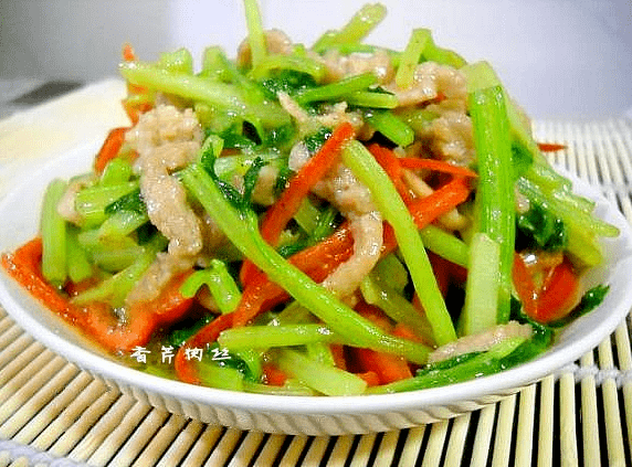 香芹炒肉丝(小土芹150克,瘦肉丝100克)