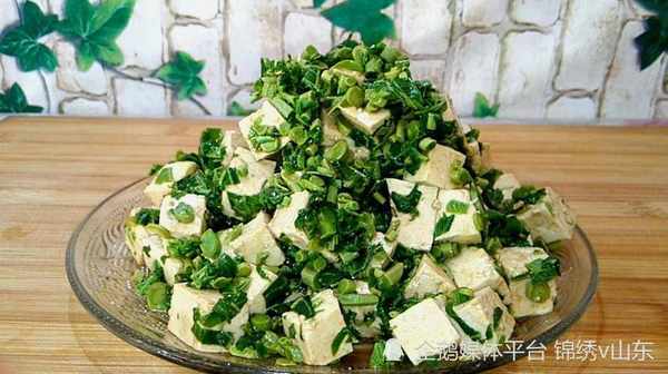 食材:嫩豆腐、香椿、盐、芝麻香油。