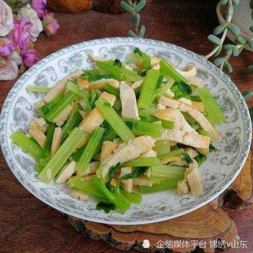 4、加芹菜和素鸡,炒30秒,加精盐调味,翻炒均匀即可。