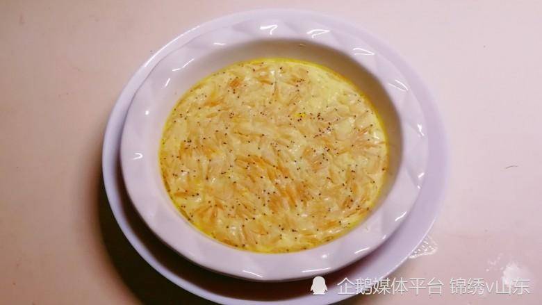 3、在蛋液中均匀地撒入切好的胡萝卜碎和虾皮,开水上锅蒸,上面要倒扣上一个盘子,防止水蒸气滴在蛋液表面,大火蒸8-10分钟,关火焖5分钟;