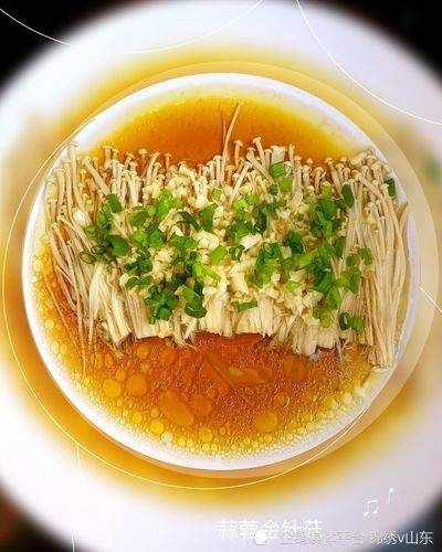 3、把调好的料汁浇在金针菇上,切一些葱花、线椒圈撒在上面,这道美味就做好了,味道鲜美,清脆爽口。