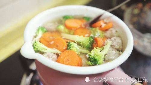 ⑤接着放入西兰花,转大火煮两分钟。最后加盐、胡椒粉调味。出锅后放些香菜就可以食用了。