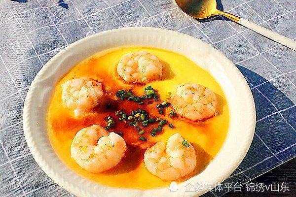 5、将虾仁摆放在蒸好的鸡蛋羹上,继续蒸五分钟。最后淋上蒸鱼豉油,撒上葱花即可上桌开吃。