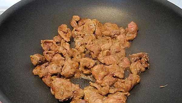 (5)烹饪:用中火继续翻炒,直到牛肉和菠萝均匀上色并熟透。用淀粉水勾芡,翻炒均匀。