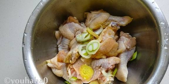 1、鸡翅根提前化冻,洗净控水,放入料酒、葱姜、盐,一点点白胡椒粉、适量的生抽抓匀,腌渍30分钟。