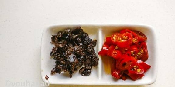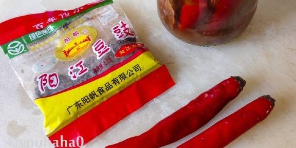 2、准备泡椒和豆豉,泡椒是自己腌制的,每年秋末辣椒多的时候腌一些。